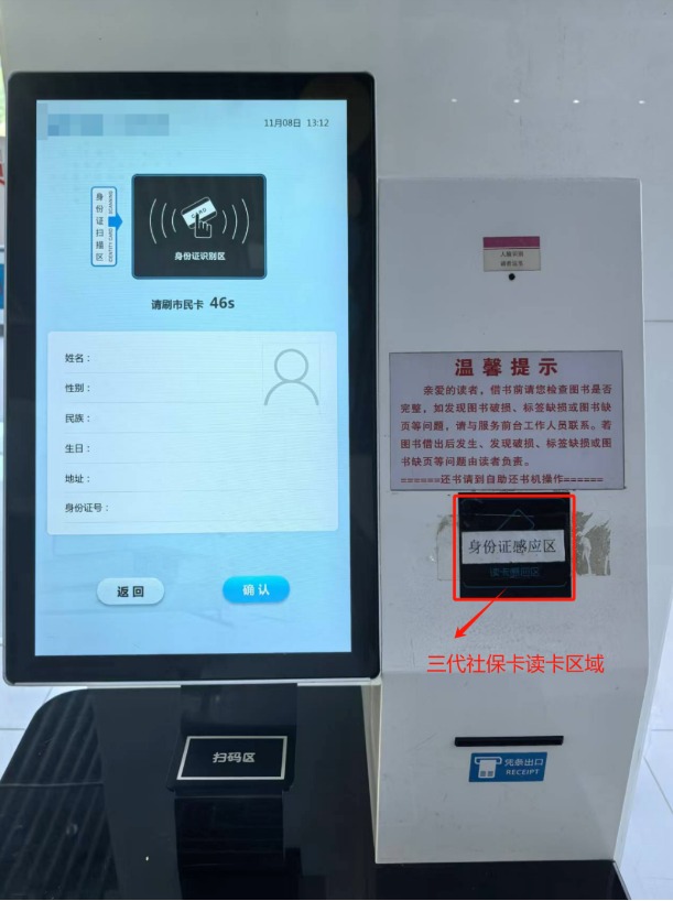 未辦理過讀者證的朋友,可使用刷三代社??ㄔ谧灾栝啓C進行注冊。將三代社??ǚ旁谧灾栝啓C的讀卡區域,等待系統識別并讀取您的個人信息,確認后根據屏幕提示,填寫聯系方式即可。