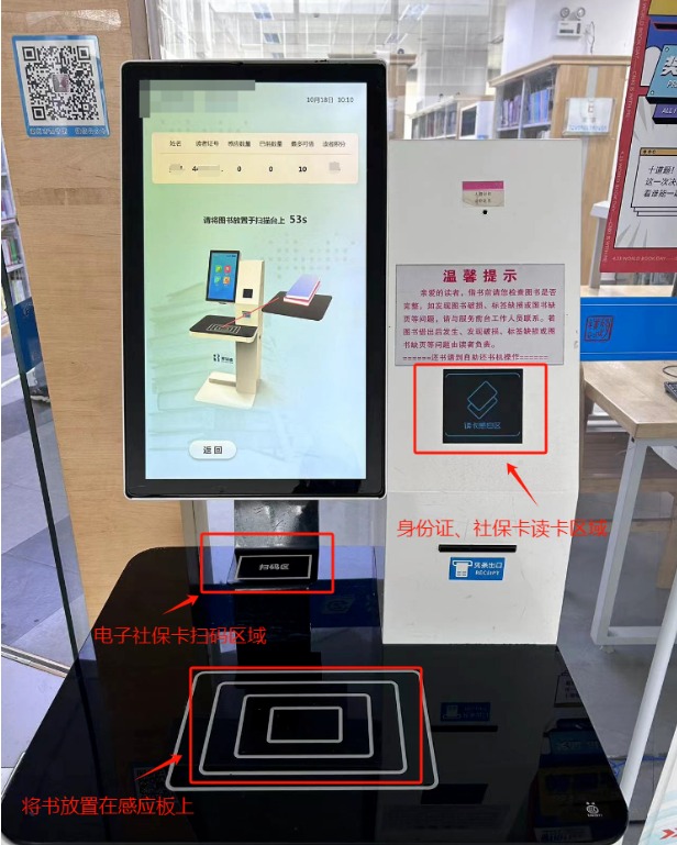 已辦理過讀者證的朋友,可直接通過刷三代社??ɑ驋呙桦娮由绫?ǘS碼兩種方式進行圖書借還操作。將三代社??ǚ旁谧灾栝啓C的讀卡區域,或在自助機掃描區域展示電子社??ǘS碼,等待系統識別,系統完成身份驗證后,將圖書放置于圖書感應區,按提示完成操作即可實現多冊圖書一次性快速借還。